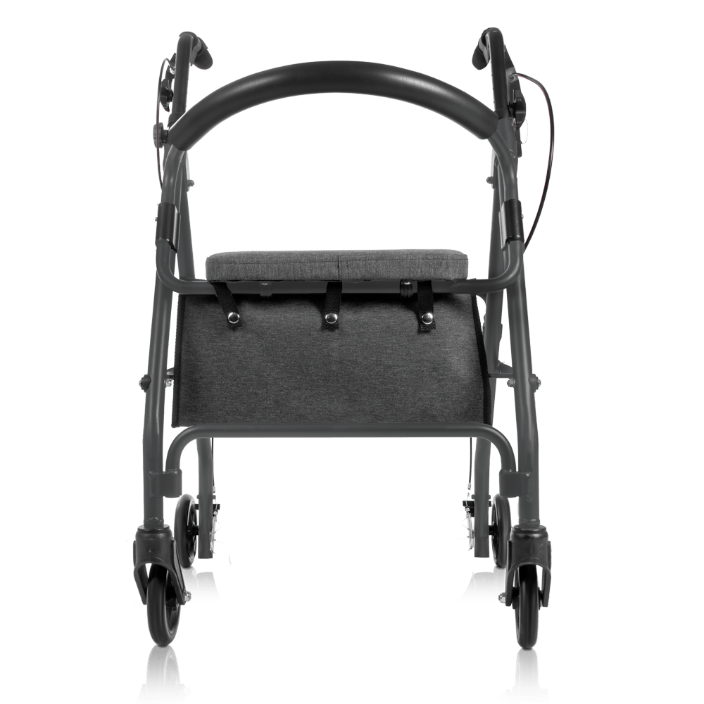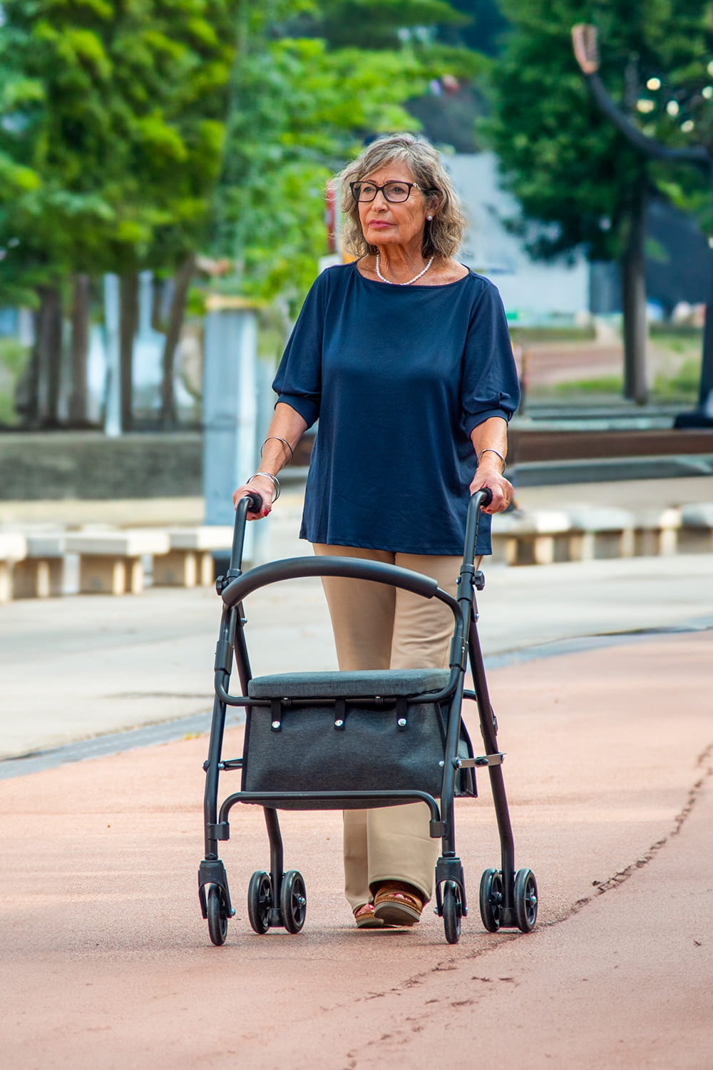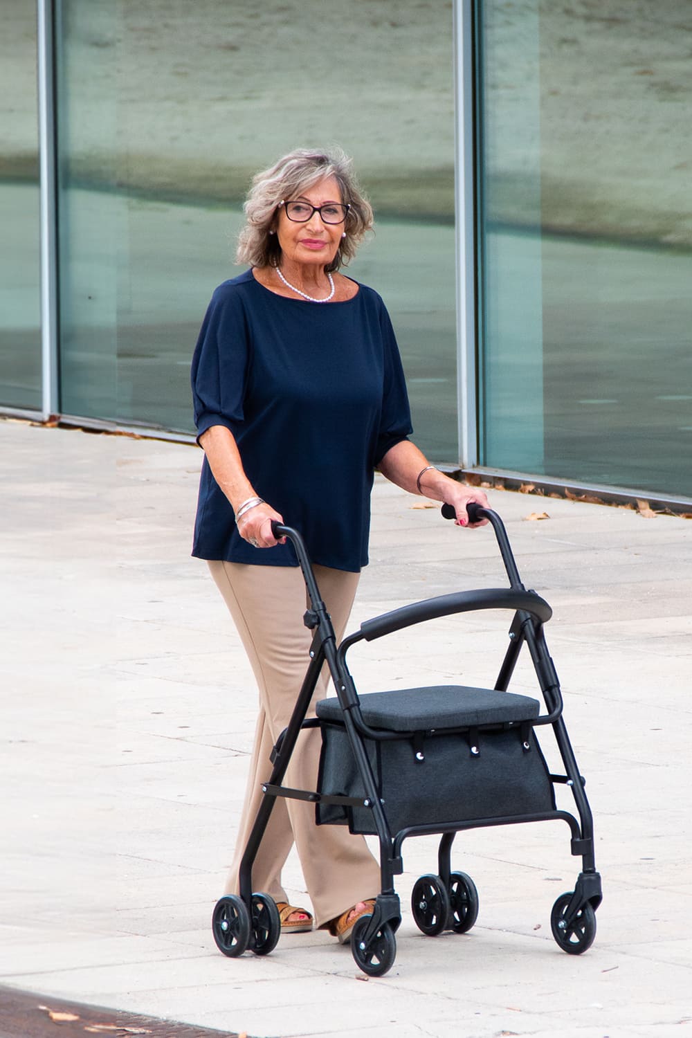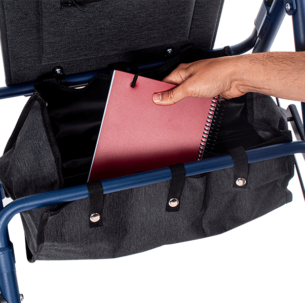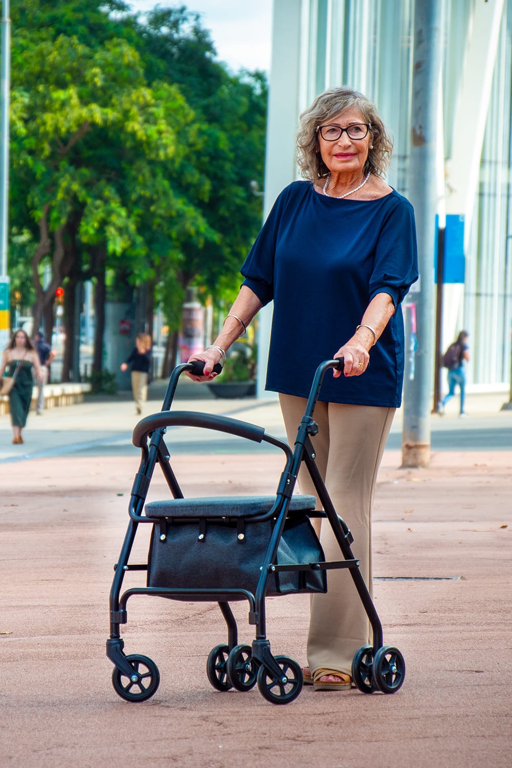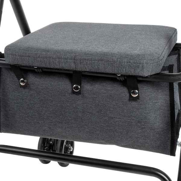 El andador 4200 ofrece un asiento amplio y acolchado de 35 cm de ancho y 34 cm de profundidad, con un espacio útil para sentarse de 45 cm. Además, cuenta con una práctica bolsa integrada para guardar pequeños objetos o documentos.