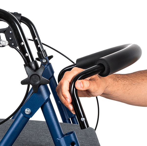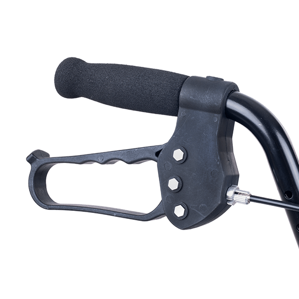 El andador 4200 ofrece dos modelos con diferentes sistemas de freno. El 4200 FP cuenta con freno de presión, donde basta con presionar los tacos para que toquen el suelo y frenen el andador. Por otro lado, el 4200 FM utiliza frenos de maneta, con dos frenos manuales en las empuñaduras para un control más preciso al frenar.