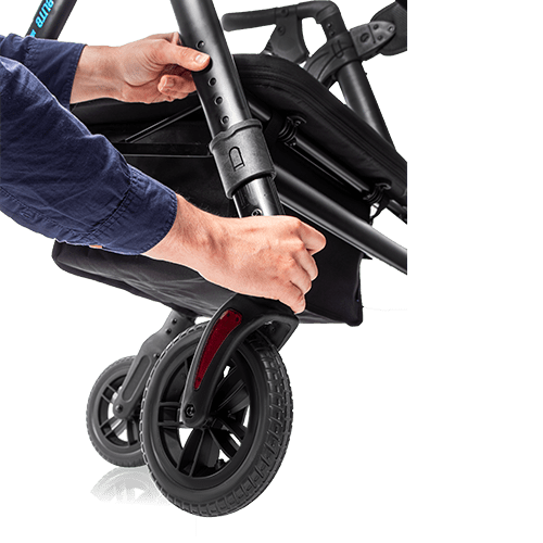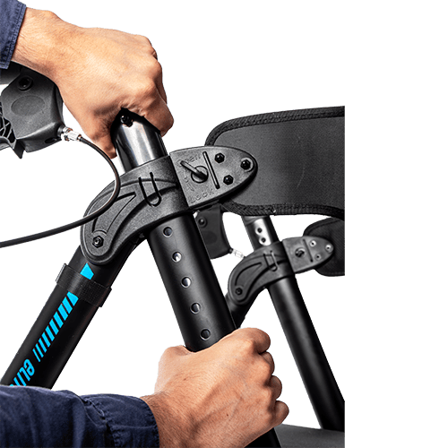 El andador Elite XL se adapta fácilmente a las necesidades del usuario gracias a su diseño ajustable. Permite regular la altura total de los puños entre 85 y 105 cm y la altura del asiento de 51 a 61 cm. Esta regulación se realiza de forma sencilla mediante un sistema quick release en las patas delanteras y traseras.