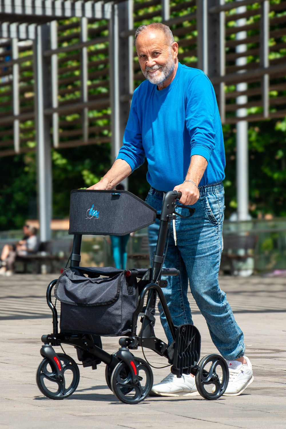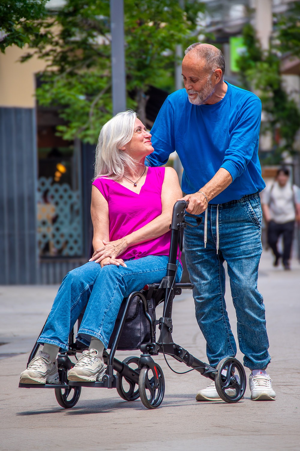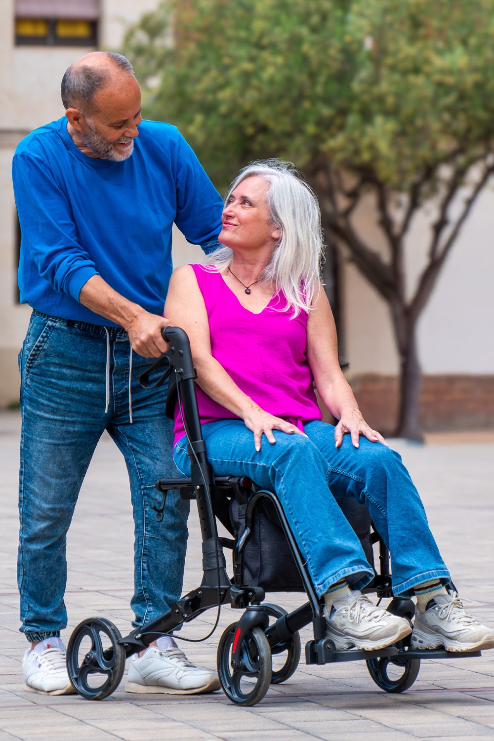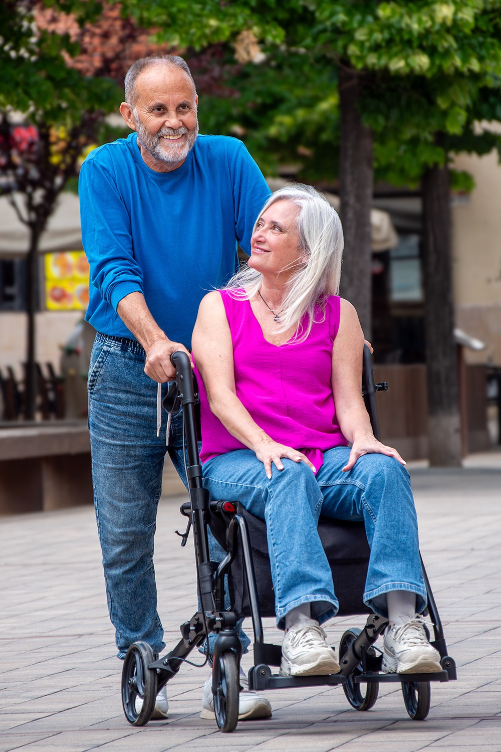 El andador Magnum Plus destaca por su diseño multifuncional, ya que puede utilizarse tanto como andador como silla de ruedas manual. Con un simple movimiento para abatir el respaldo y girar los reposapiés, el usuario puede convertirlo fácilmente en una cómoda y segura silla de ruedas, adaptando su posición según sus necesidades.