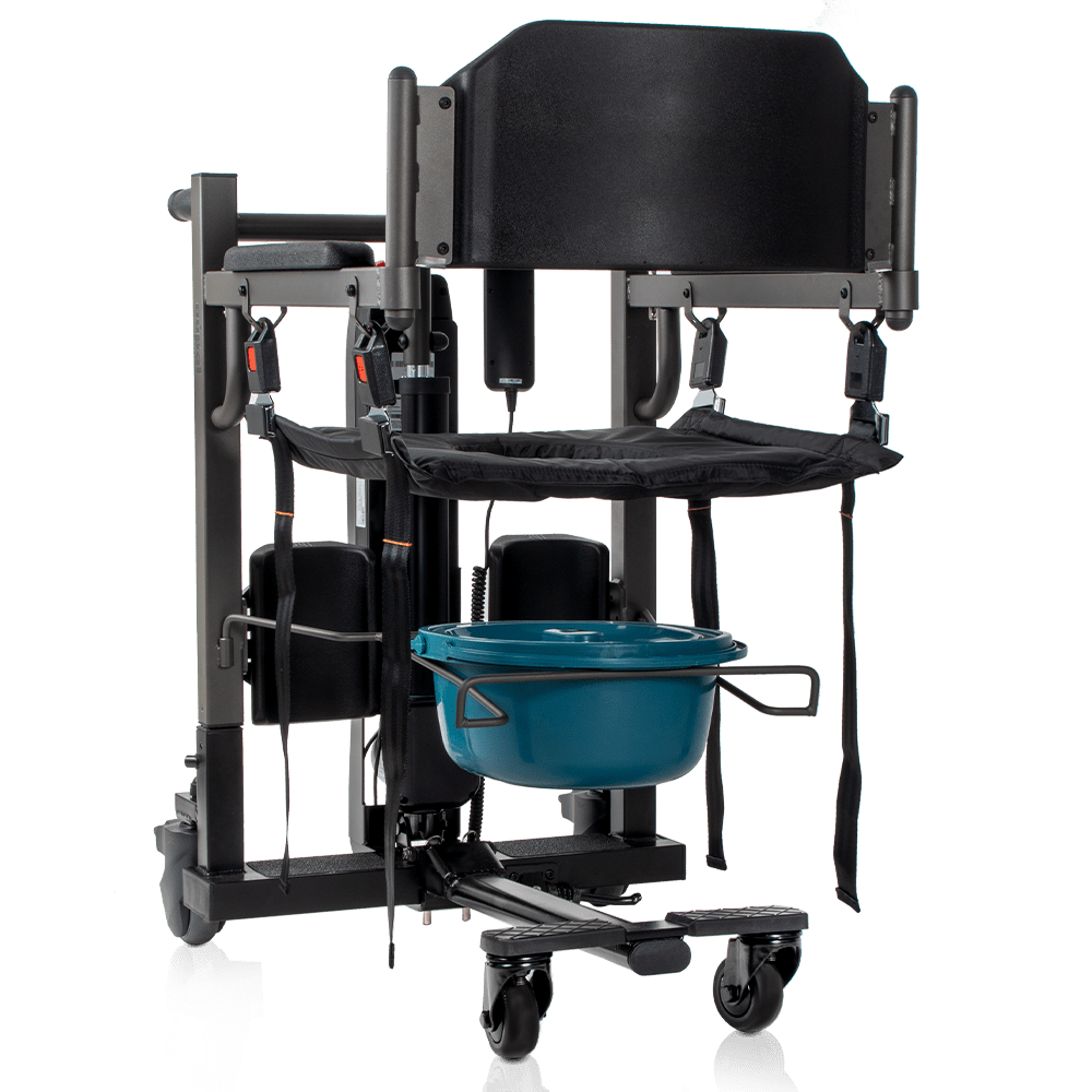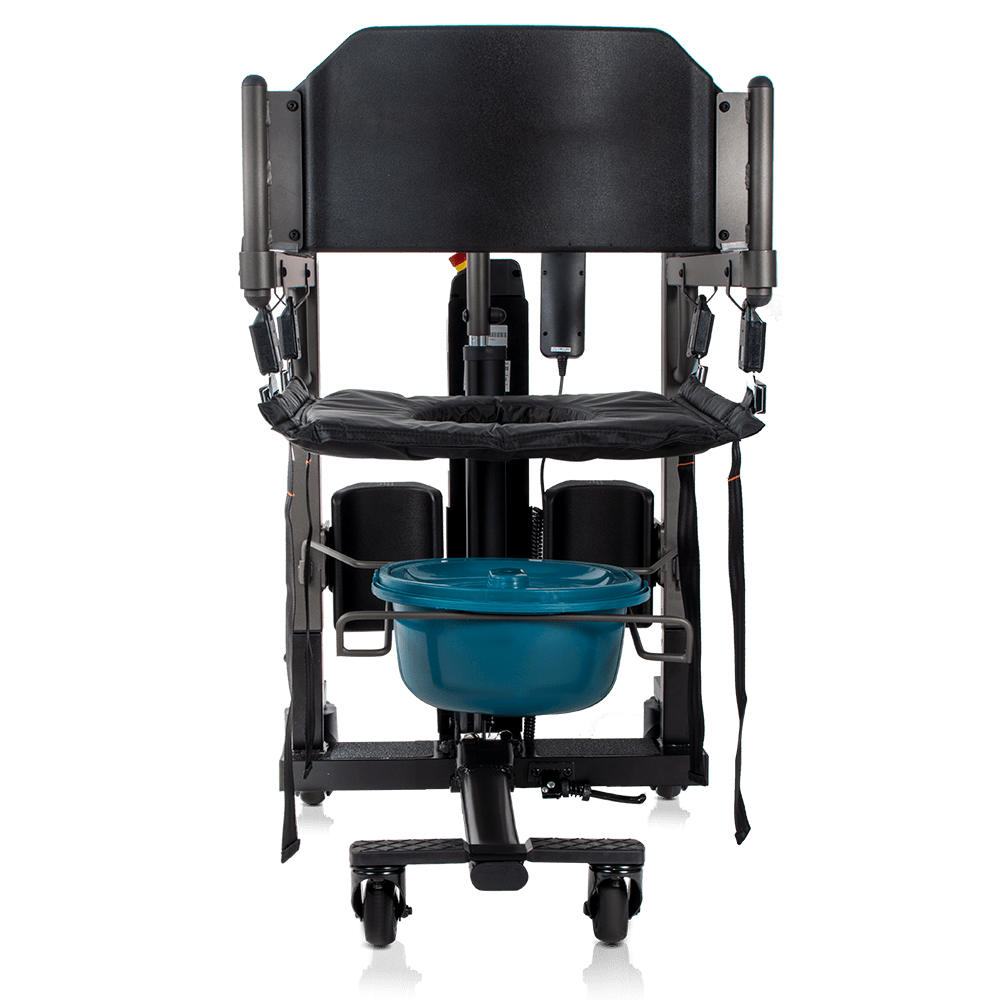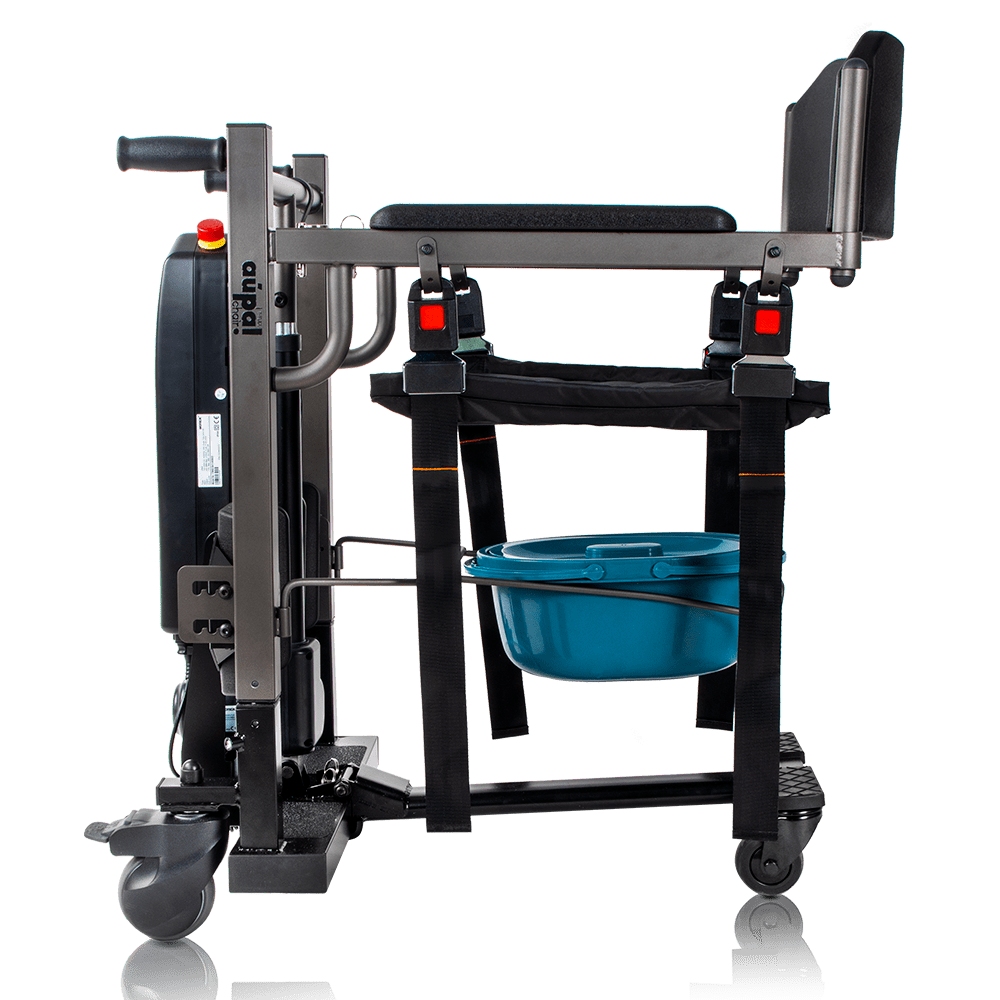 Gracias a la separación entre las patas, puede ingresar al baño y acercarse a su inodoro. Utilice el arnés con la abertura central para que el usuario pueda emplear la Aúpa Chair como silla inodoro. Además, cuenta con una cubeta de accesorio.