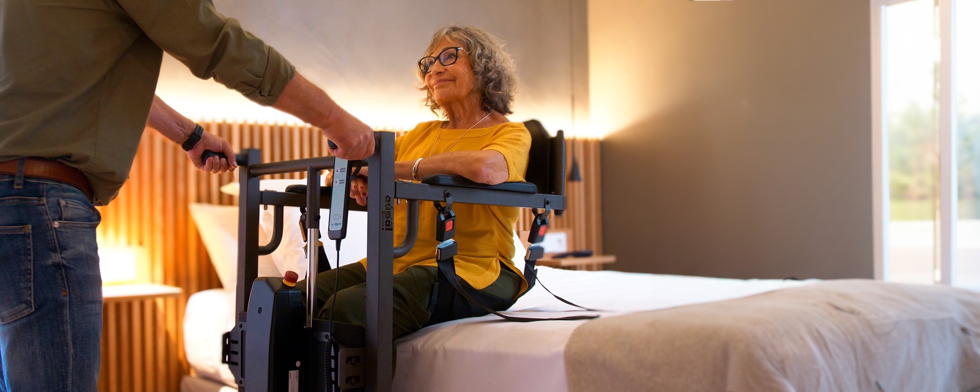 Con la Aúpa Chair, también es posible realizar transferencias directamente desde la cama. Este método es de los más sencillos: simplemente deslice las patas de la grúa por debajo de las de la cama y aplique la transferencia.