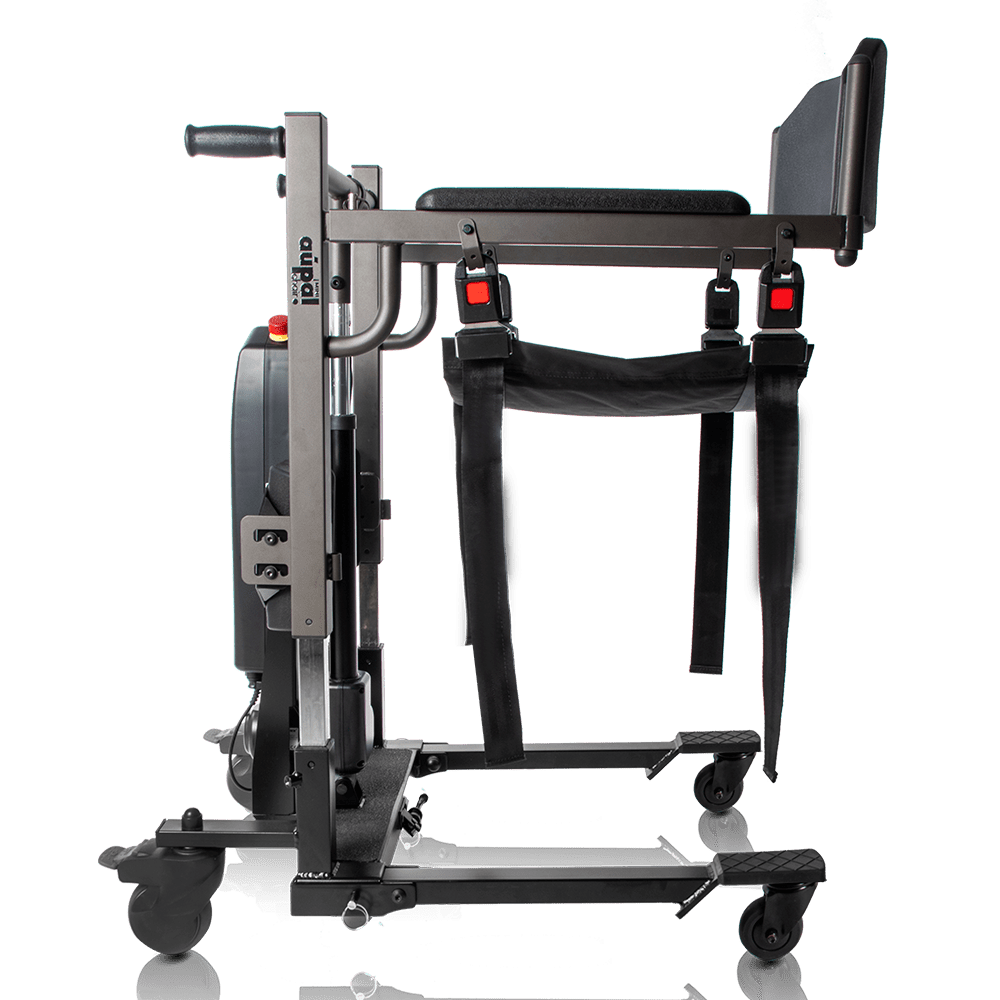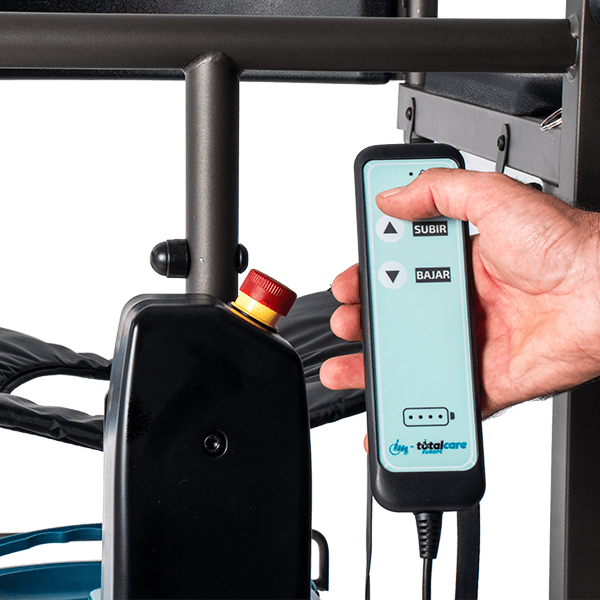 También permite realizar transferencias a sillas de ruedas, abata los reposabrazos y posiciónela. La transferencia en silla de ruedas se realiza de manera más óptima con el modelo Aúpa Chair T-Flex, gracias a su pata central.