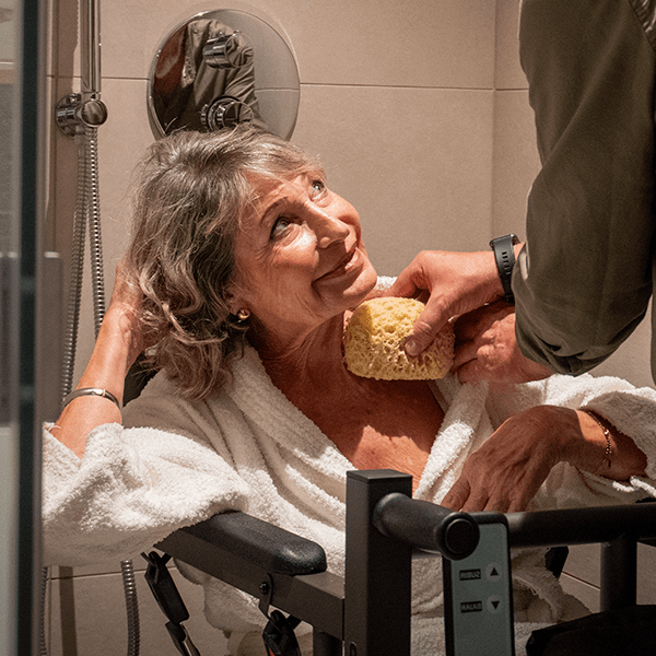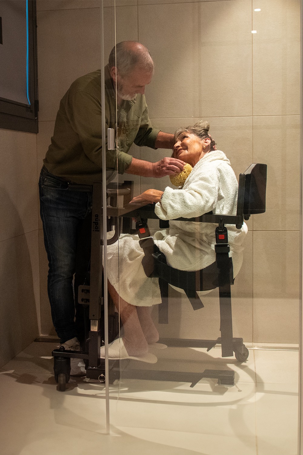 Ingrese fácilmente a la ducha o a cualquier zona húmeda de su baño para garantizar una higiene personal óptima para el usuario. El chasis de la Aúpa Chair es resistente al agua.