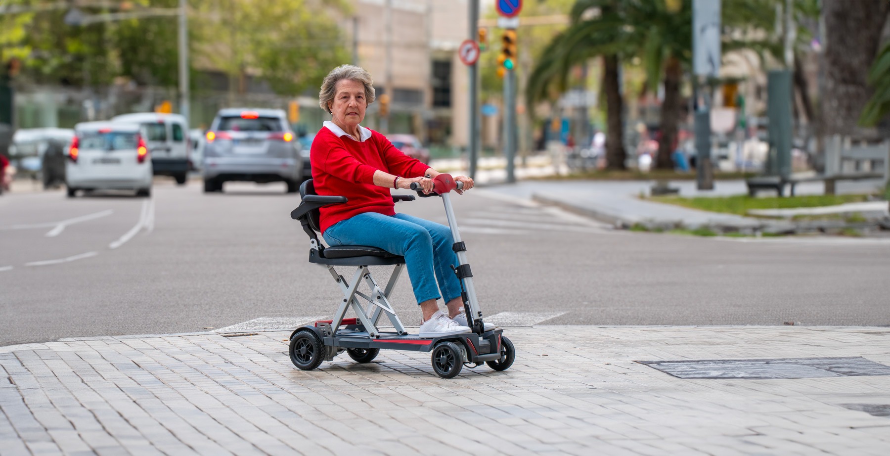 El scooter Formentera se distingue por su chasis compacto y ligero. Con una profundidad de 97 cm y un ancho total de 46 cm sin reposabrazos, este modelo es extremadamente manejable, permitiendo su uso en espacios reducidos, el paso por puertas estrechas y la entrada en ascensores pequeños. Con un peso de solo 21 kg sin batería, el Formentera es fácil de manejar y transportar, siendo sencillo de cargar en el maletero de un coche sin esfuerzo.