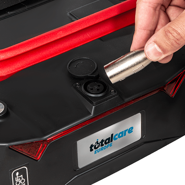 Toma de carga ubicada en la parte trasera del scooter, compatible con cargadores de 2 Ah.