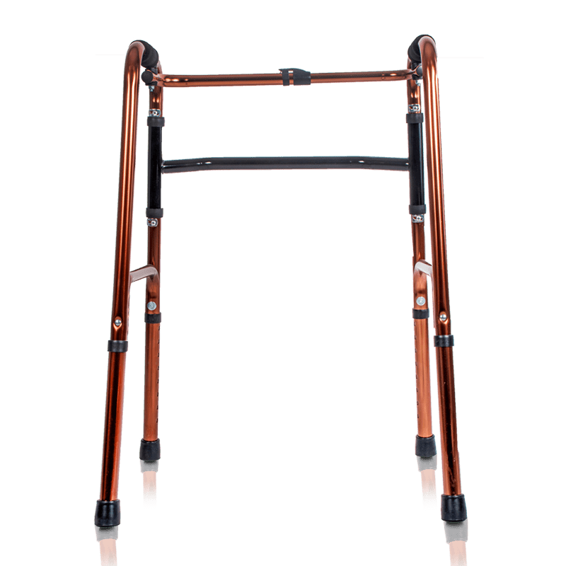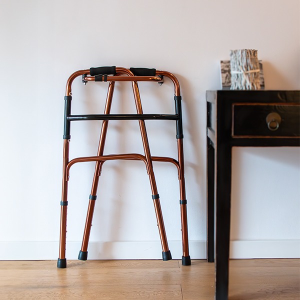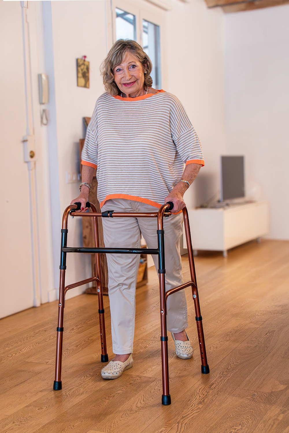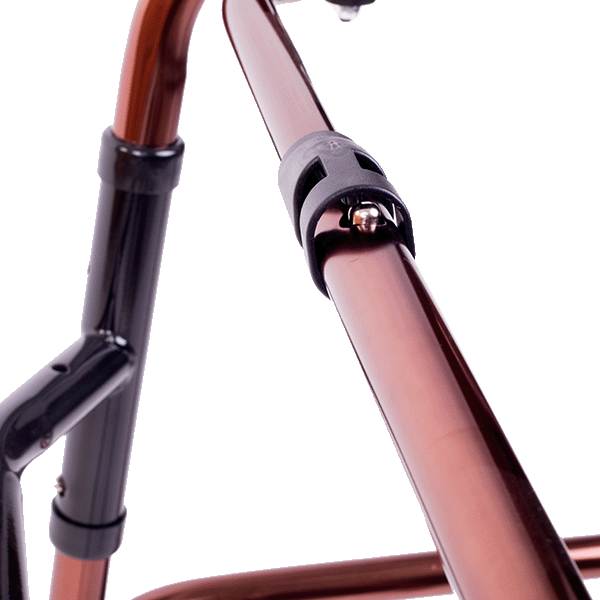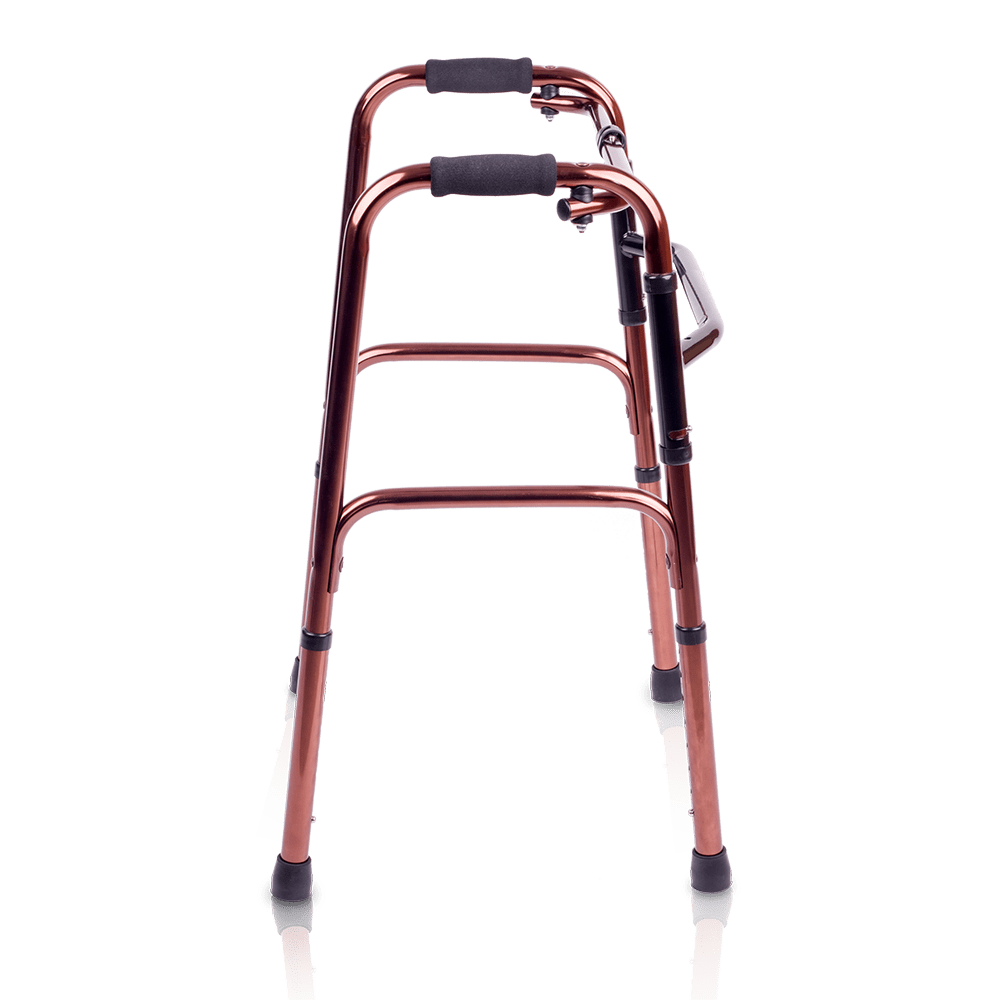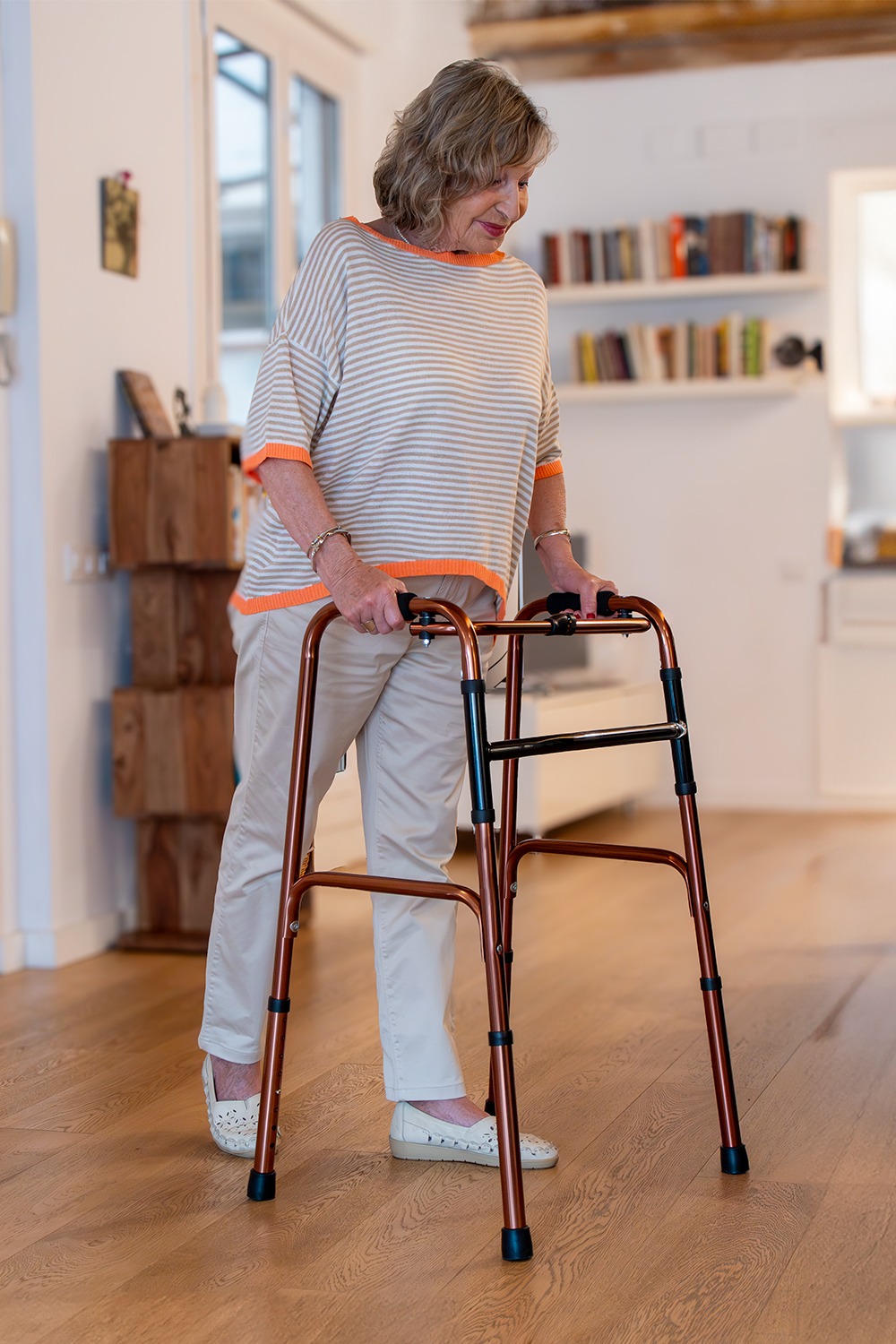 Disponível numa elegante cor de cobre e com pegas revestidas a neopreno para maior conforto. Com um peso total de 2,20 kg, este andarilho é capaz de suportar até 100 kg de peso máximo.